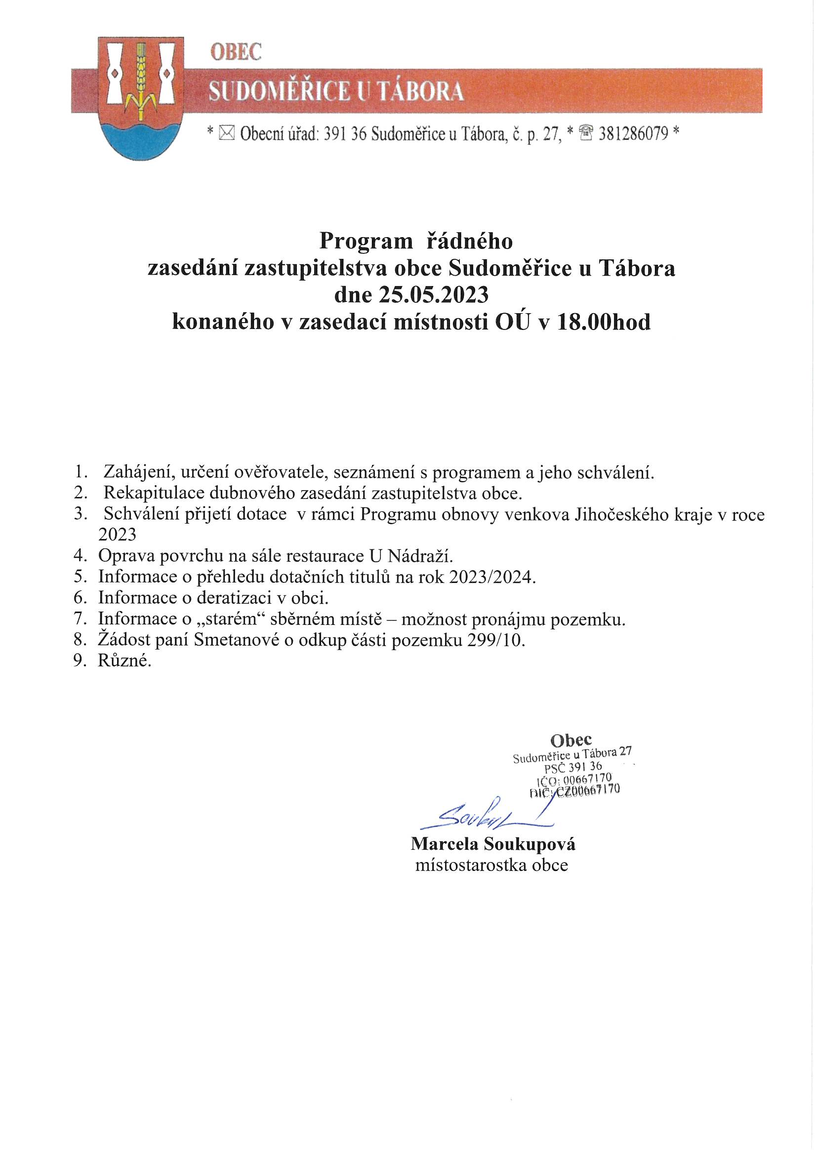 Řádné zasedání zastupitelstva obce Sudoměřice u Tábora